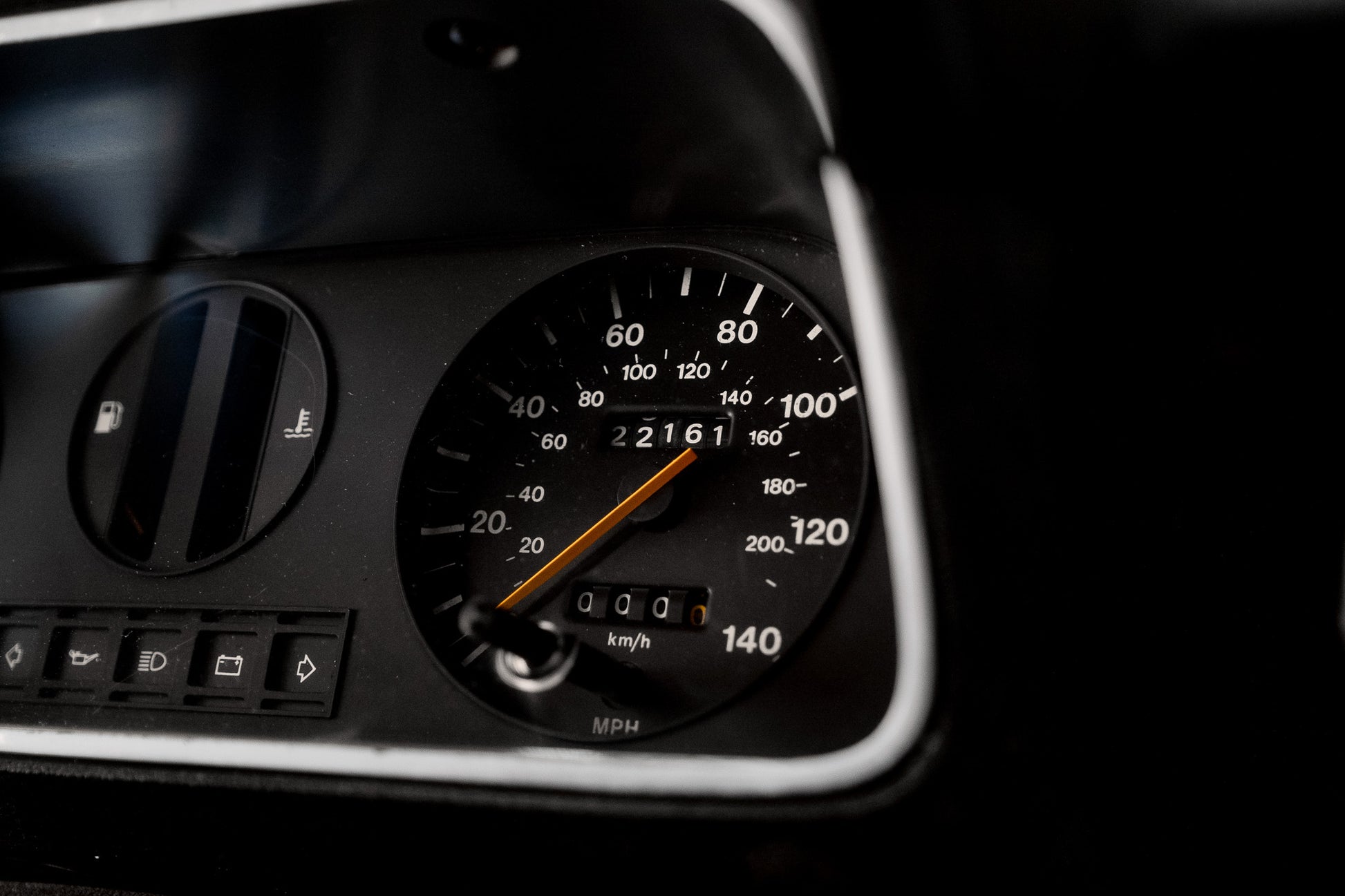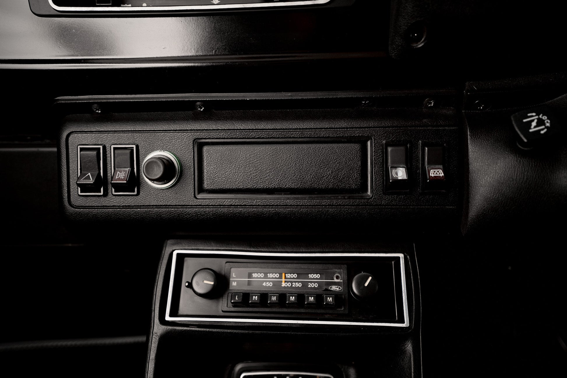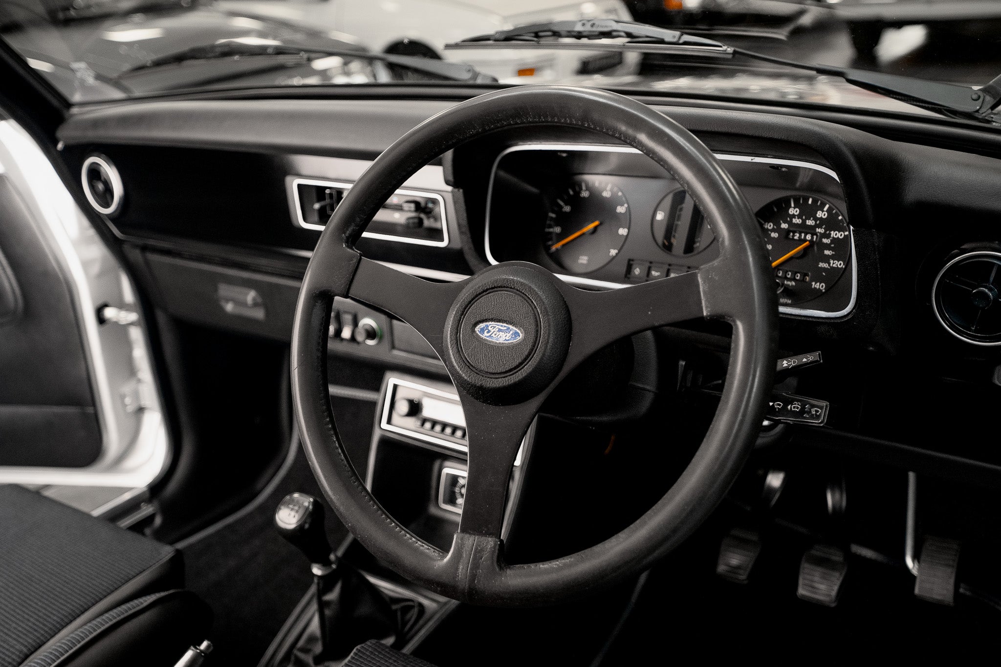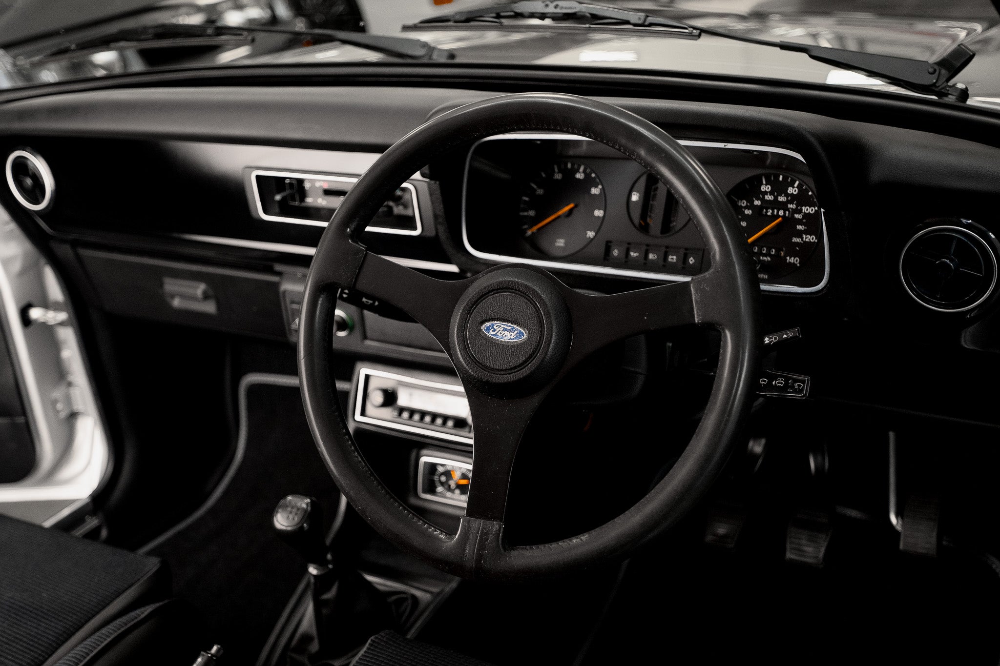 The dashboard remains as Ford intended minimalistic, functional, and full of seventies character. The glovebox sits low on the passenger side, with a round adjustable heater vent positioned just above. Slide-toggle ventilation controls sit centrally flanked by original push-button switchgear for hazards, rear screen heater, brake warning function and cigarette lighter all operating as expected. Ahead of the driver, the binnacle houses the essentials with clarity and simplicity tachometer to the left, fuel and temperature gauges centrally placed, and the speedometer to the right showing 22,161 miles. All obligatory warning lights illuminate and extinguish correctly on start-up. A final round heater vent to the right side completes a dashboard that is refreshingly honest, original and free from unnecessary modification.