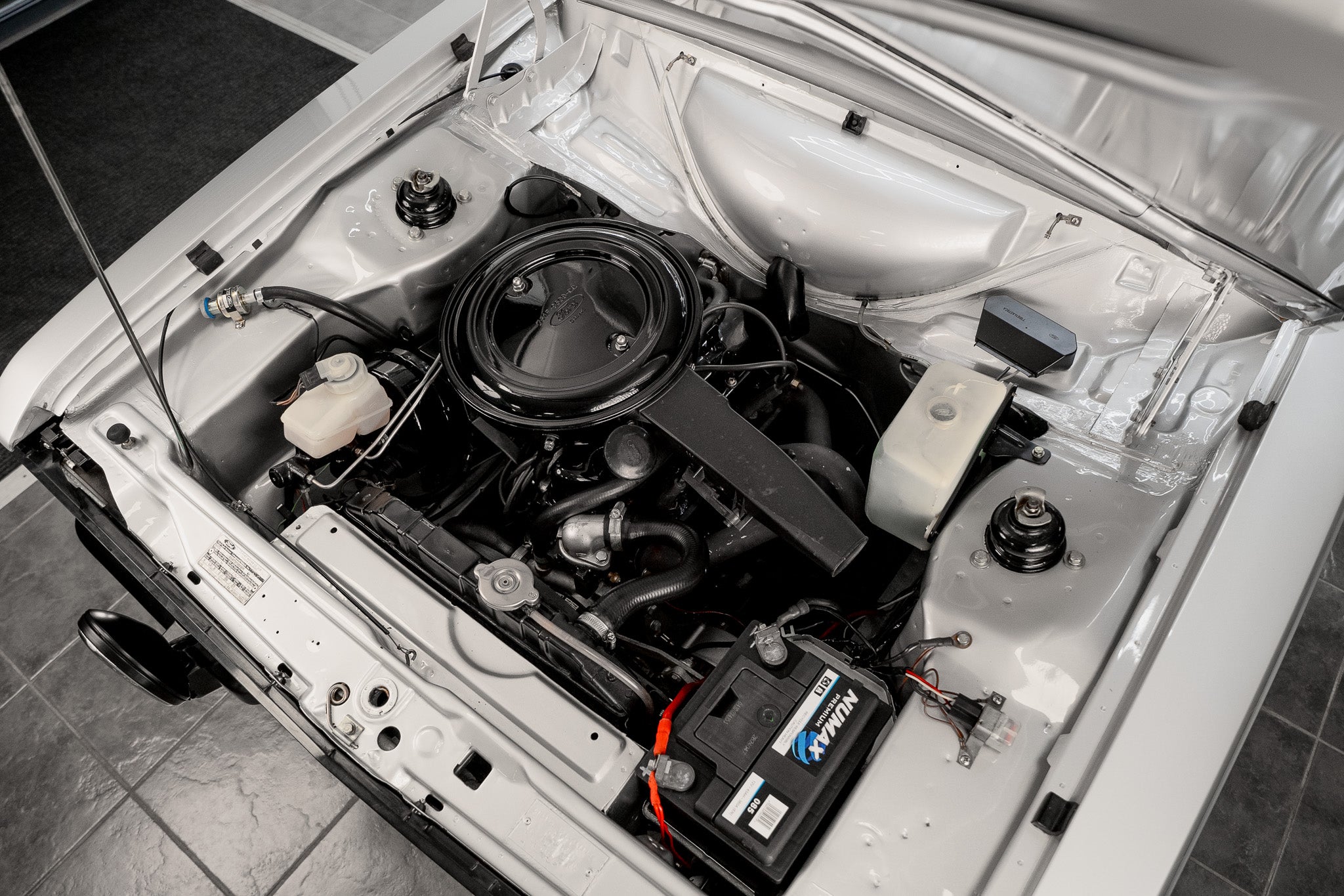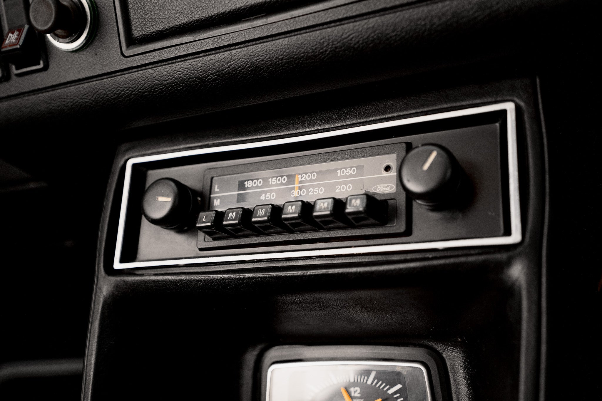 The three-spoke flat-face steering wheel presents very well while the four-speed manual gear lever and surround sit neatly and comfortably within the centre console operating precisely with the familiarity only a Ford gearbox offers. To finish, the cabin is complemented by its original Ford push-button radio, still in place the final detail in a cockpit that remains wonderfully pure, highly authentic and increasingly difficult to find in this condition.