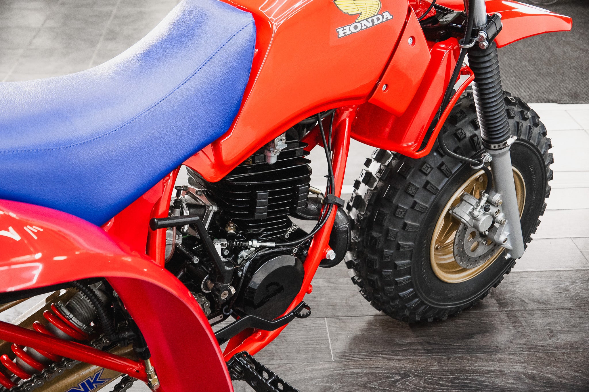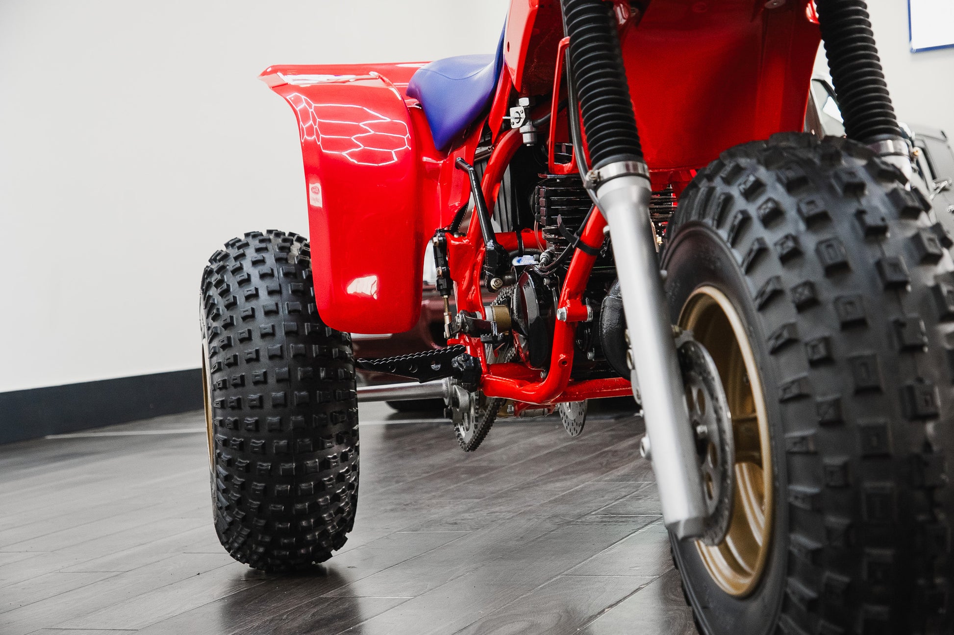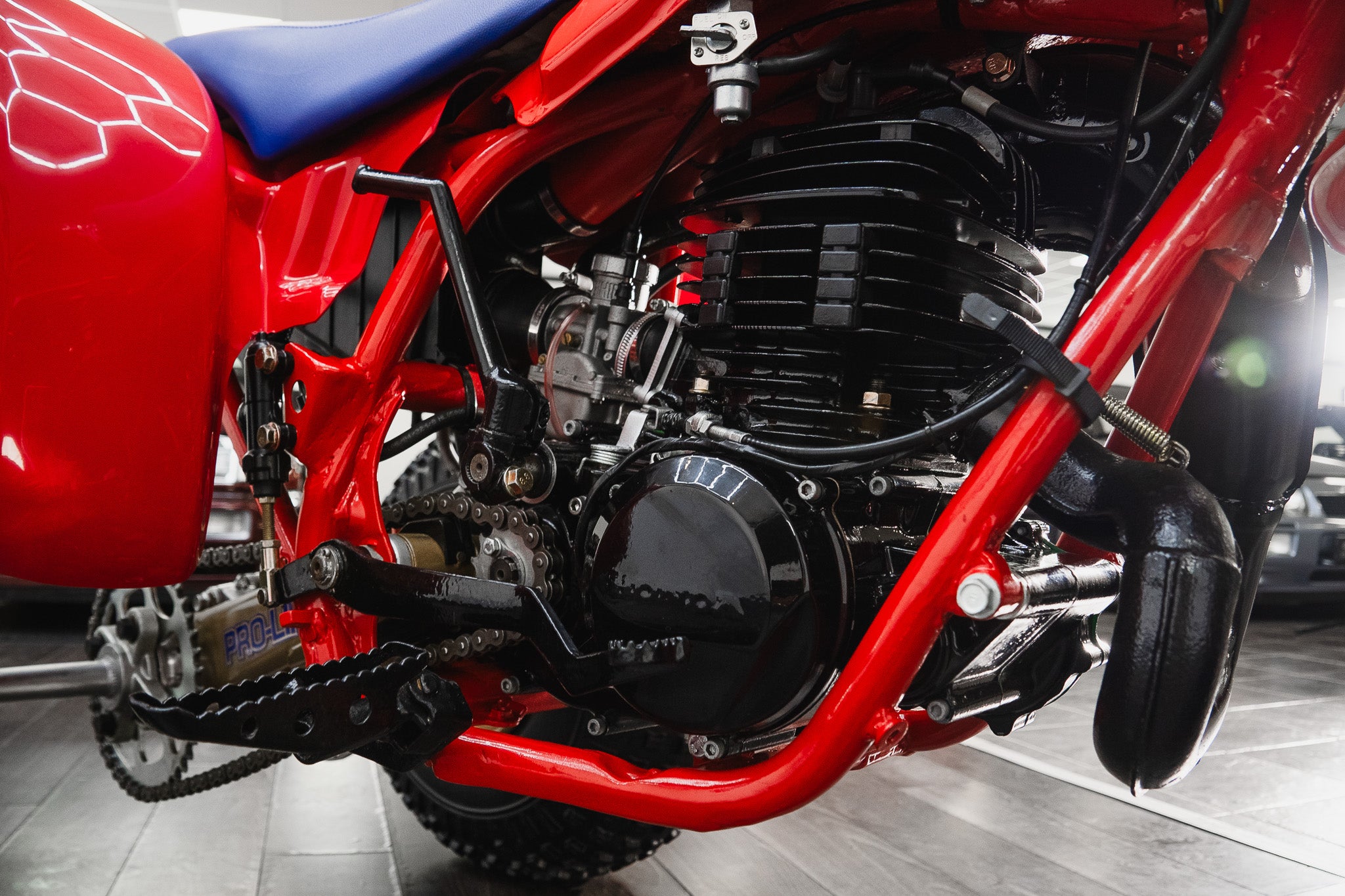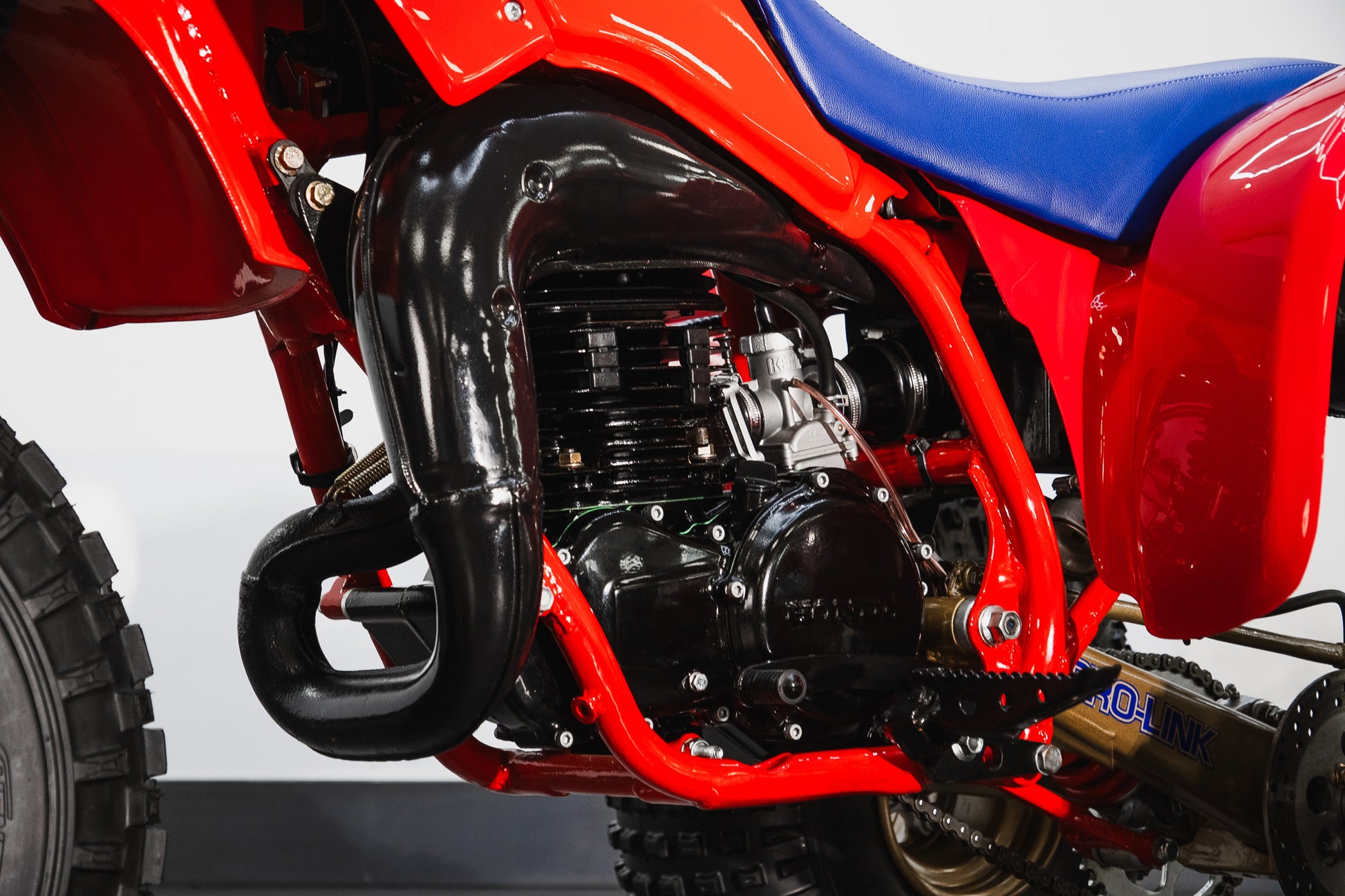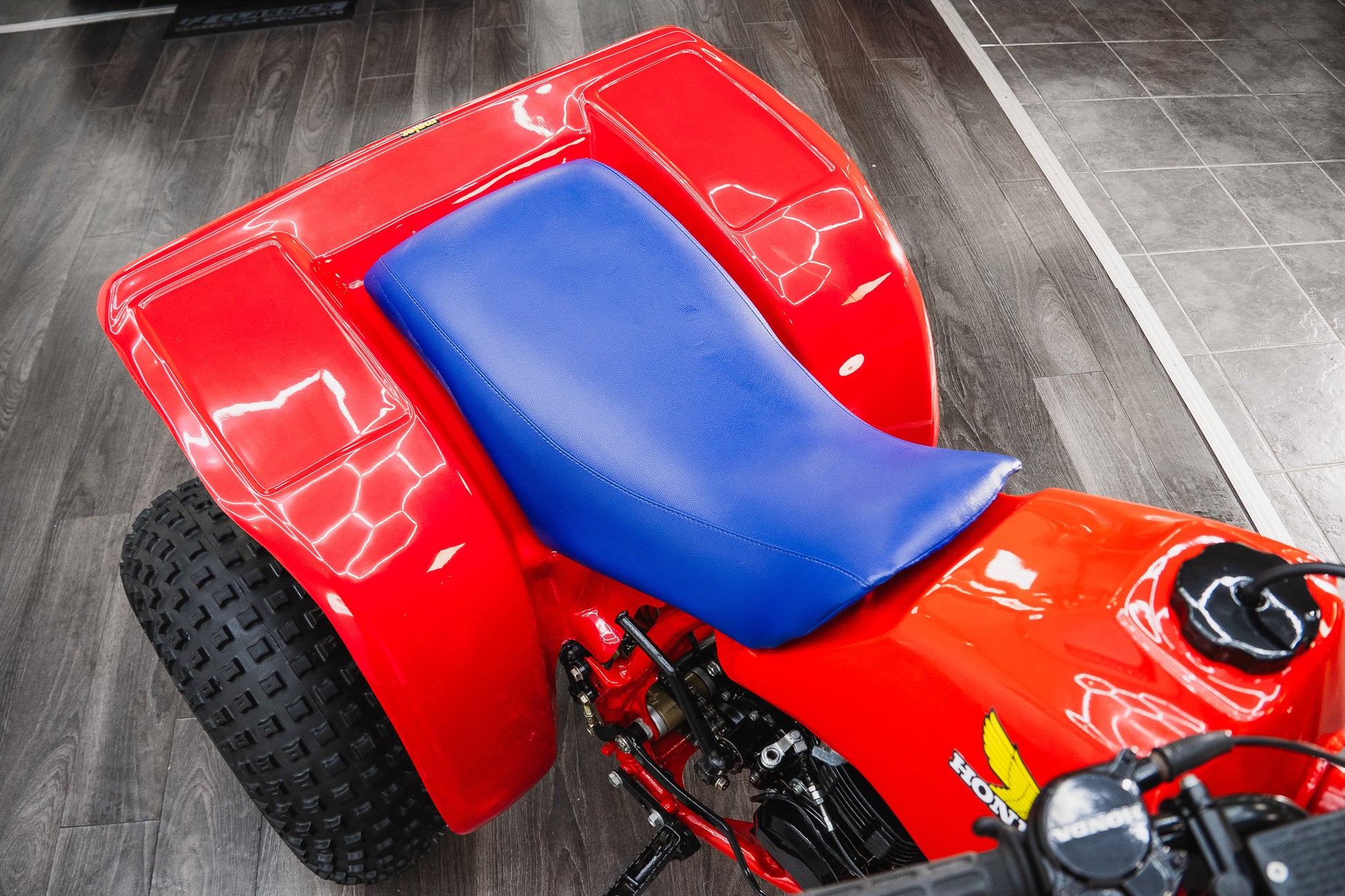 Finished in classic Honda Red, the machine presents with real presence and authenticity. The red plastic mudguards and fairings display a rich, even finish, highlighting the sharp, purposeful styling that made the ATC 250R instantly recognisable in its era.