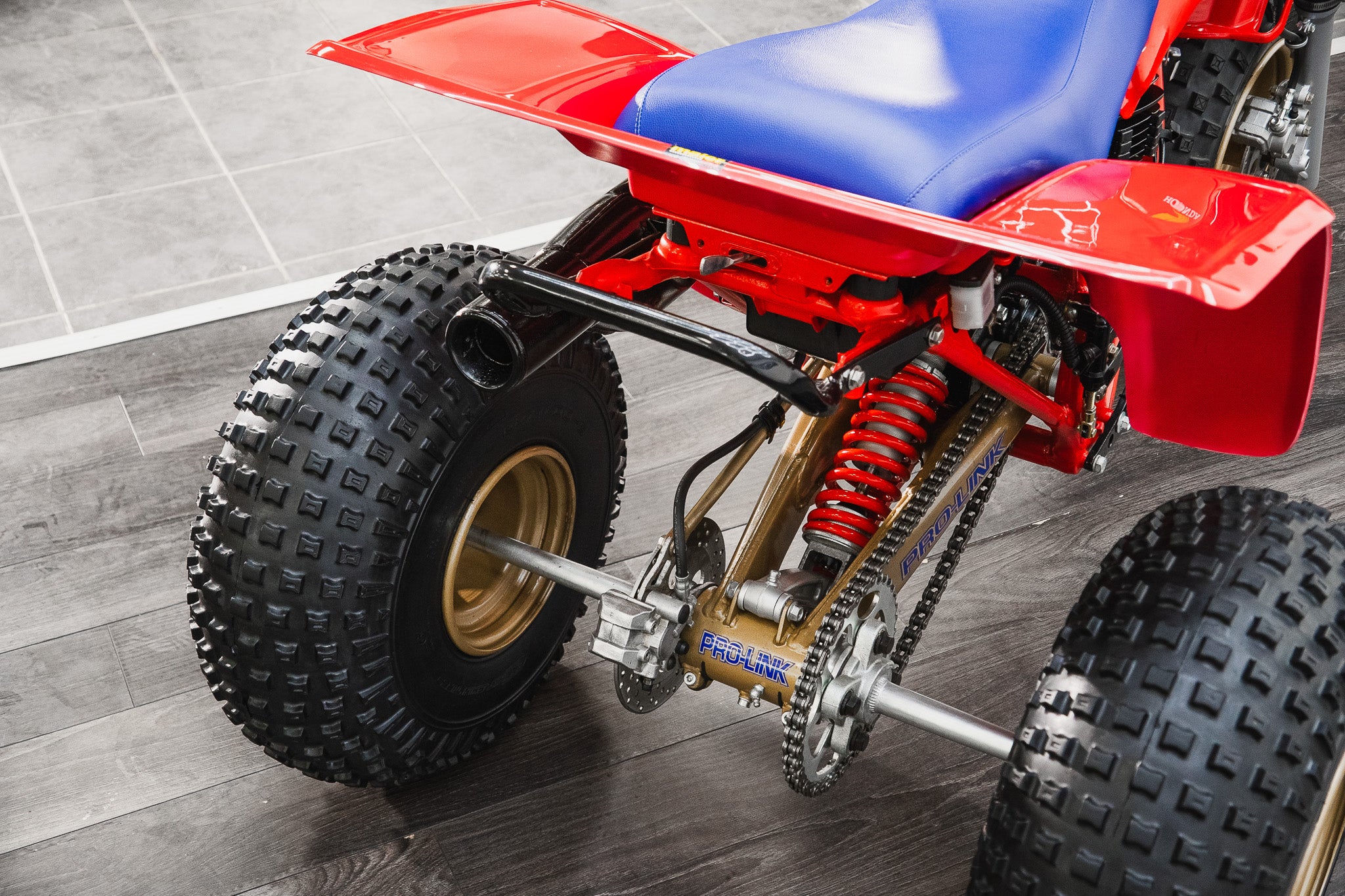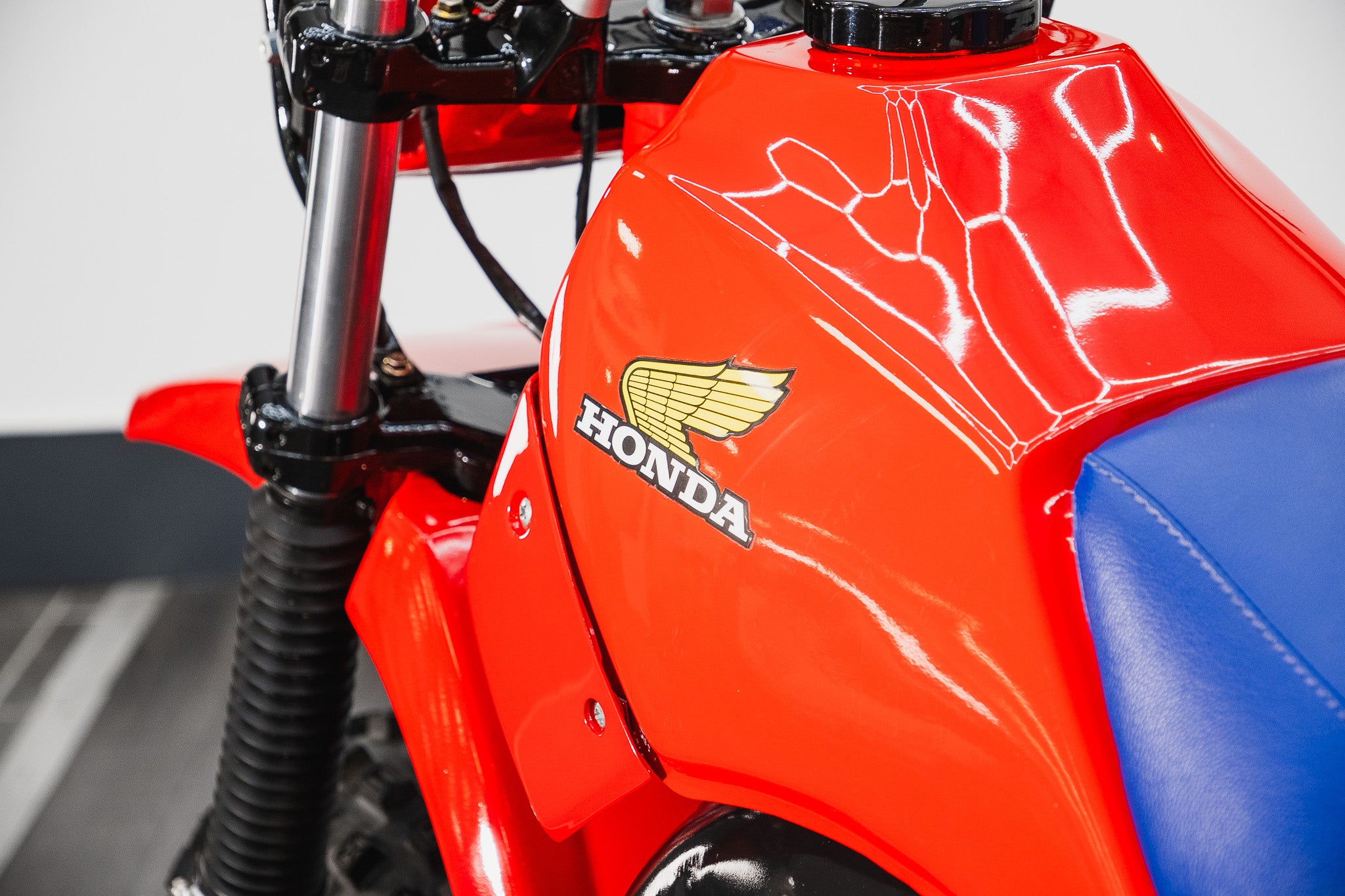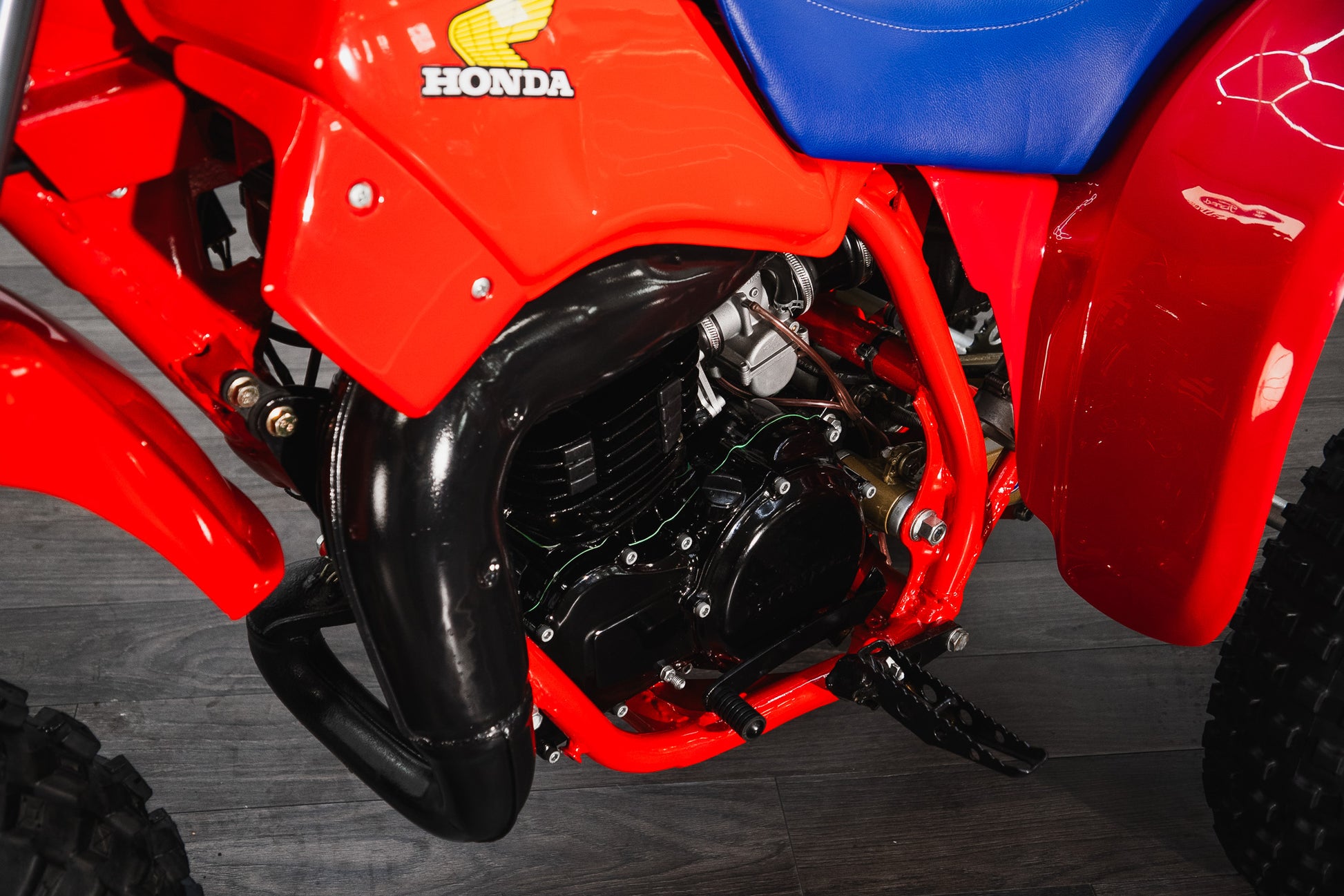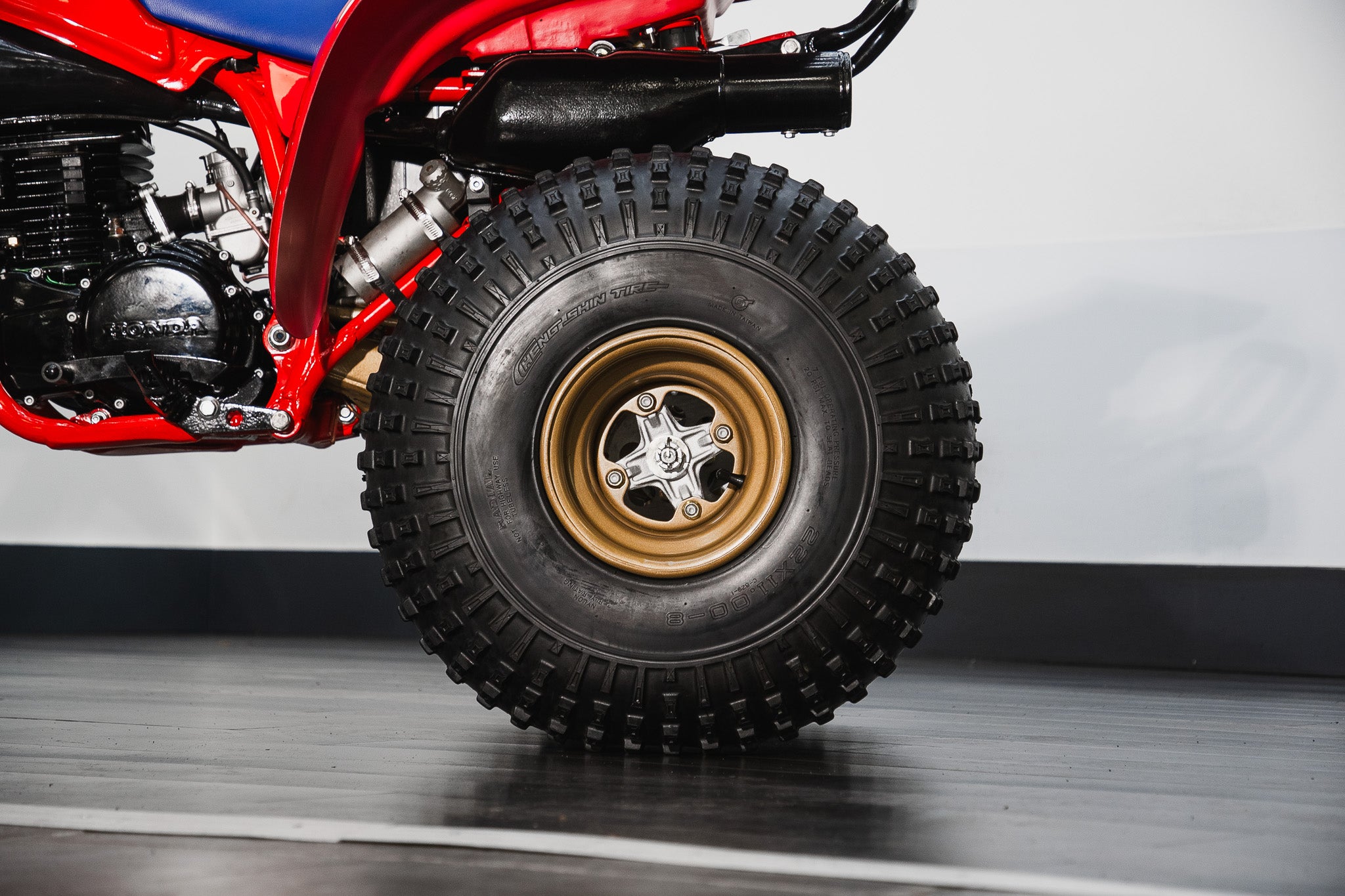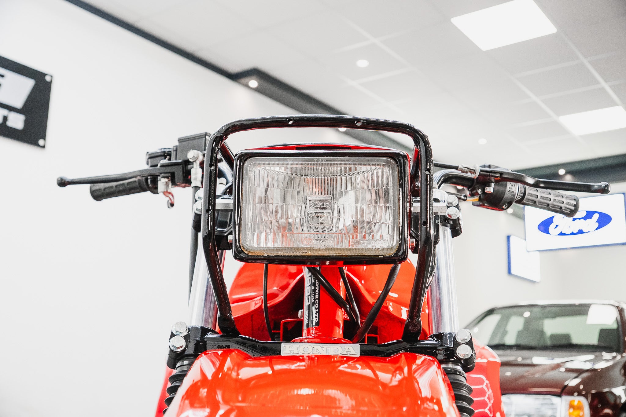 Finished in classic Honda Red, the machine presents with real presence and authenticity. The red plastic mudguards and fairings display a rich, even finish, highlighting the sharp, purposeful styling that made the ATC 250R instantly recognisable in its era.