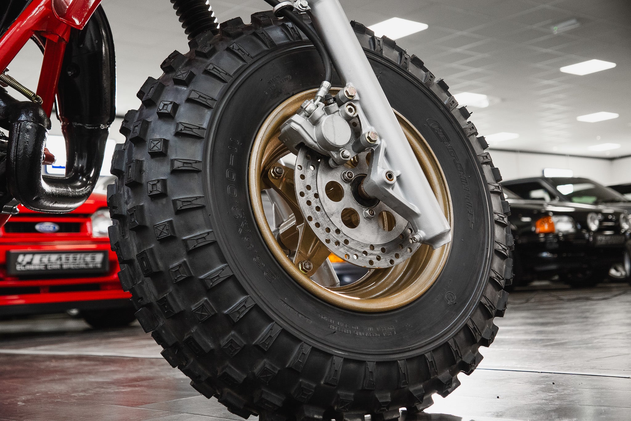 This example sits on correct 23.5 x 8.00-11 off-road tyres, mounted on striking gold-coloured rims all of which present in very good condition. The wheel and tyre combination not only enhances the machine’s aggressive stance but remains faithful to its period-correct specification.