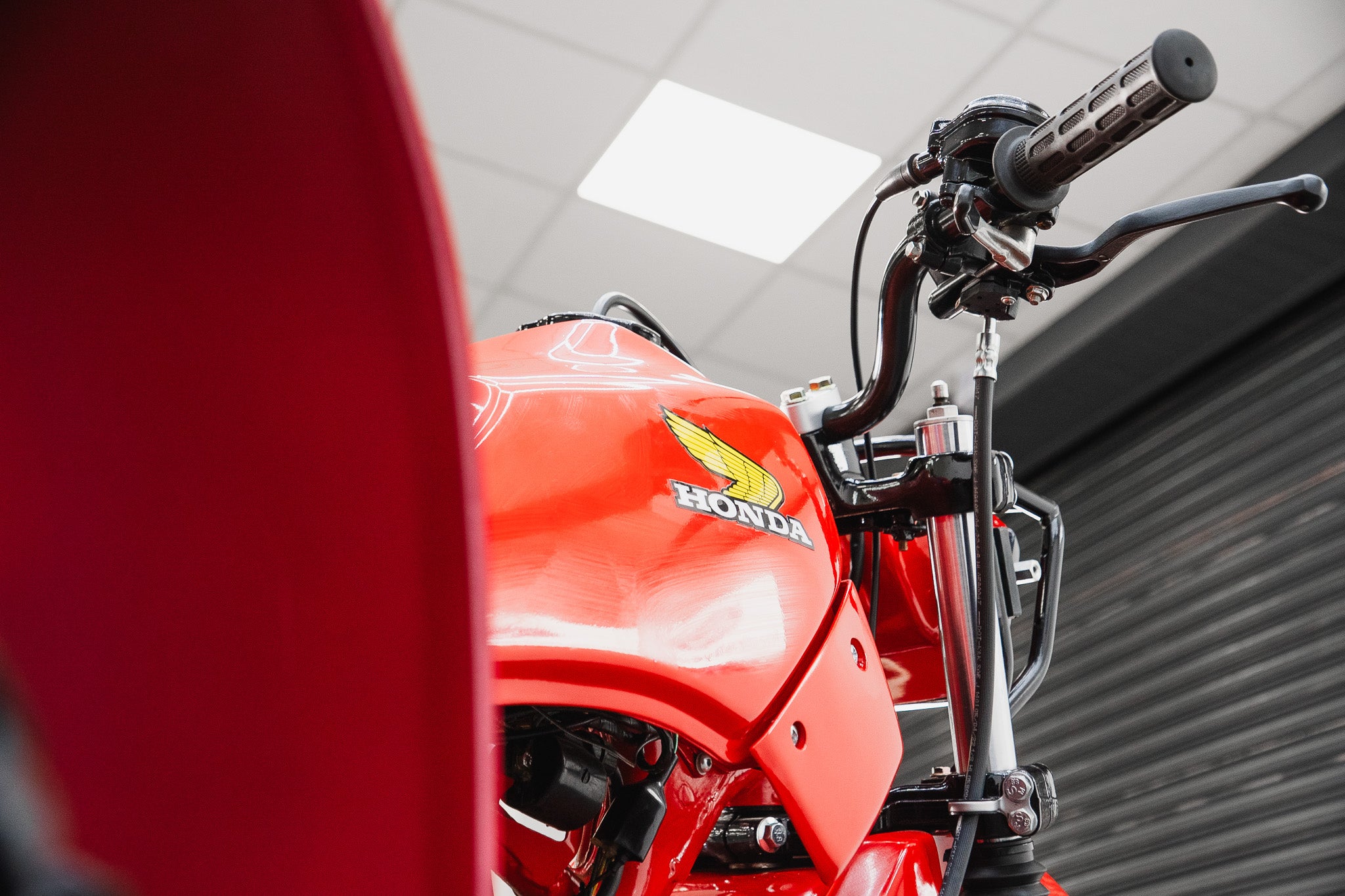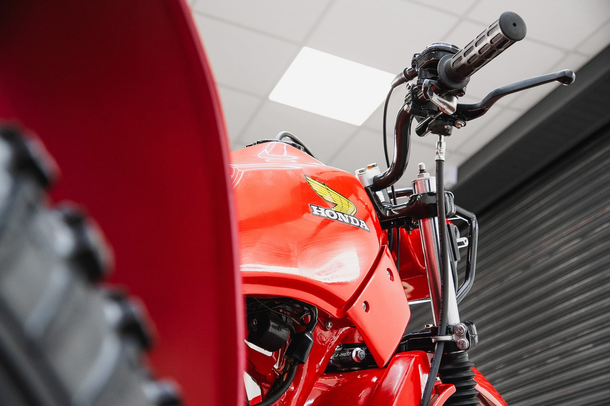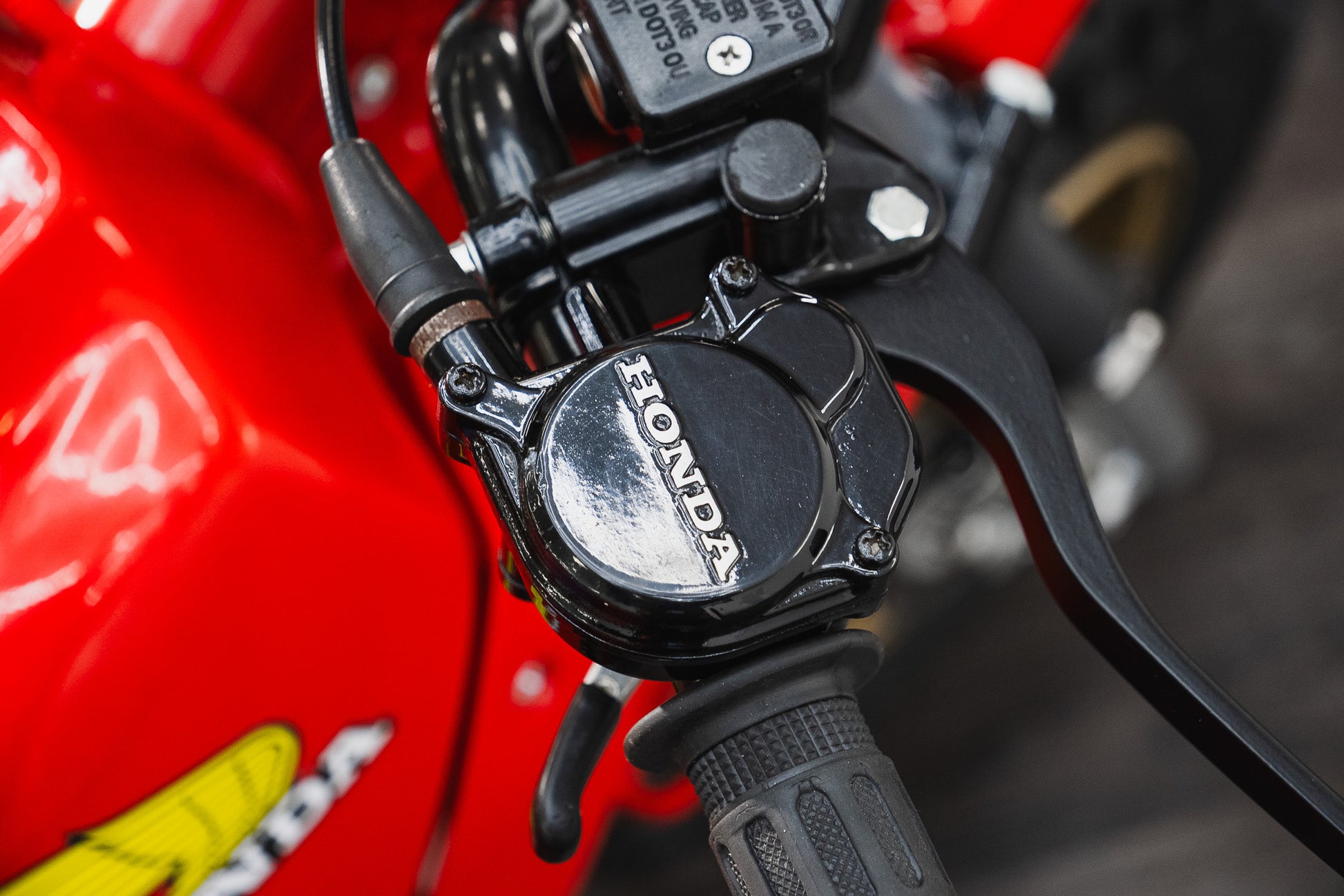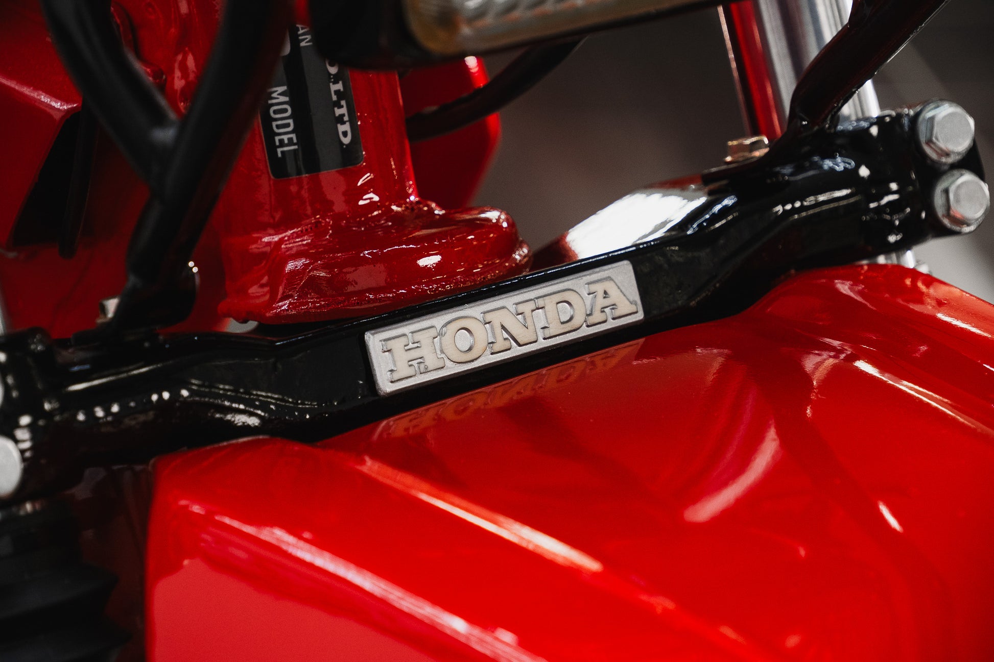 Beneath, the Honda red frame presents in outstanding condition, finished in its correct gloss coating and displays beautifully throughout. Clean, straight, and well-preserved, it reflects a machine that has clearly benefited from careful ownership and a high level of attention to detail.