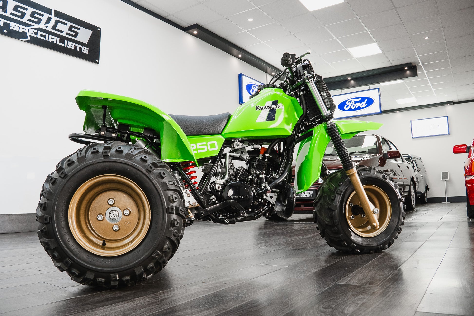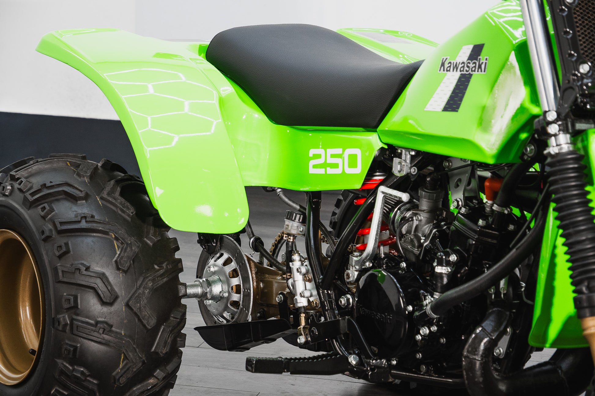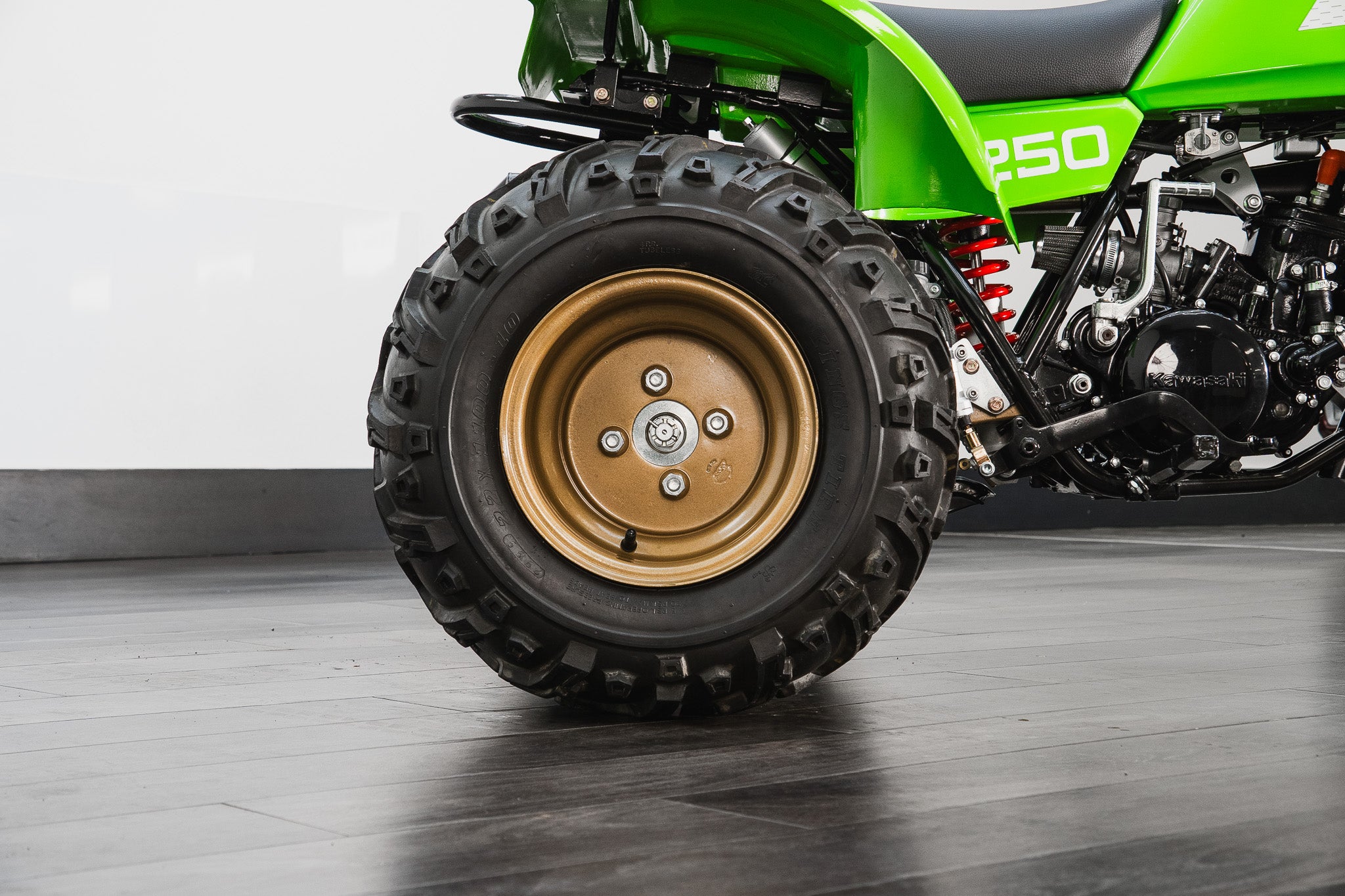 This example sits on correct 22 x 11.00-10 off-road tyres fitted to striking gold-coloured rims, all of which present in very good condition, complementing the overall aesthetic while remaining true to the machine’s purposeful stance.