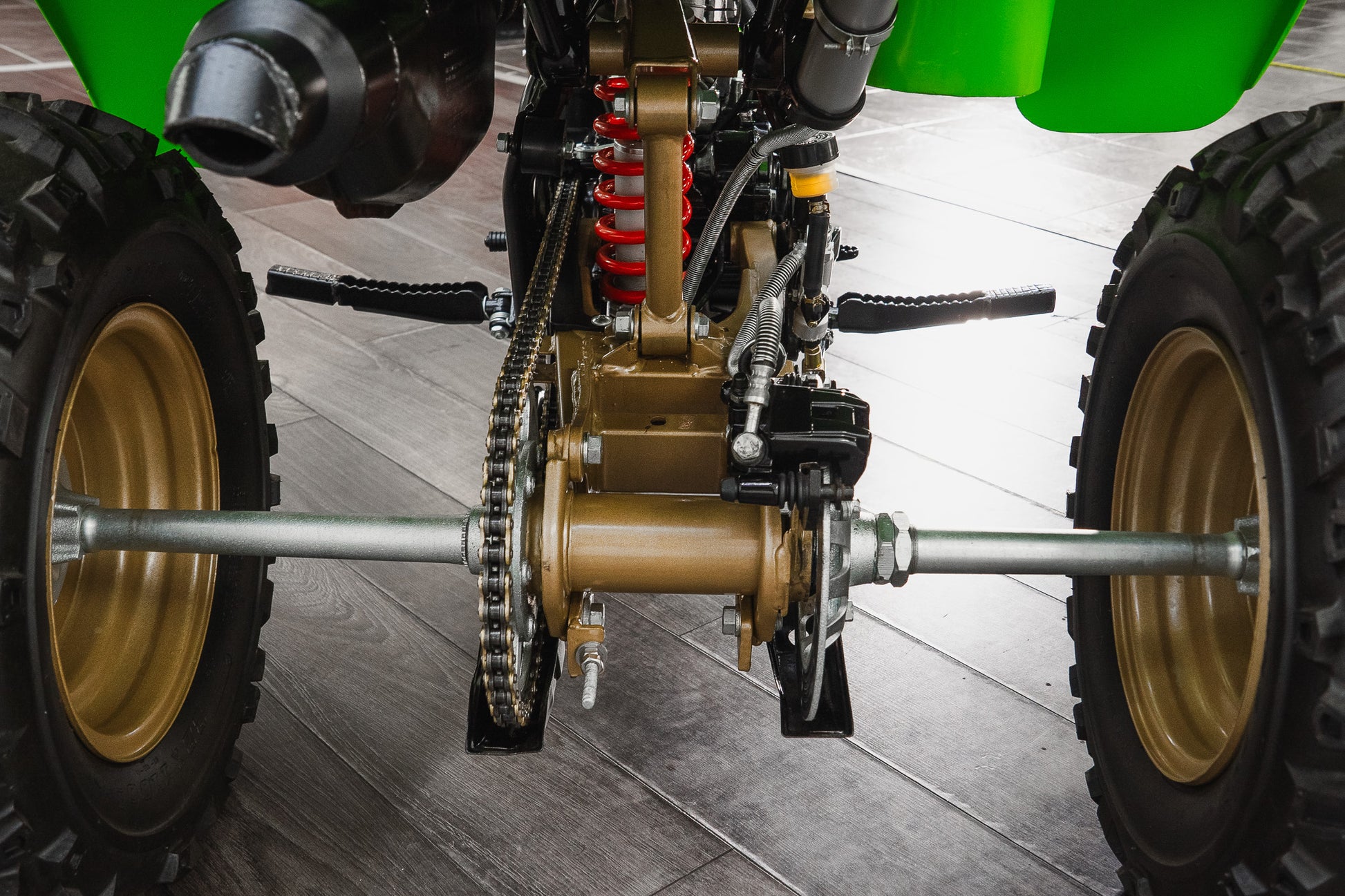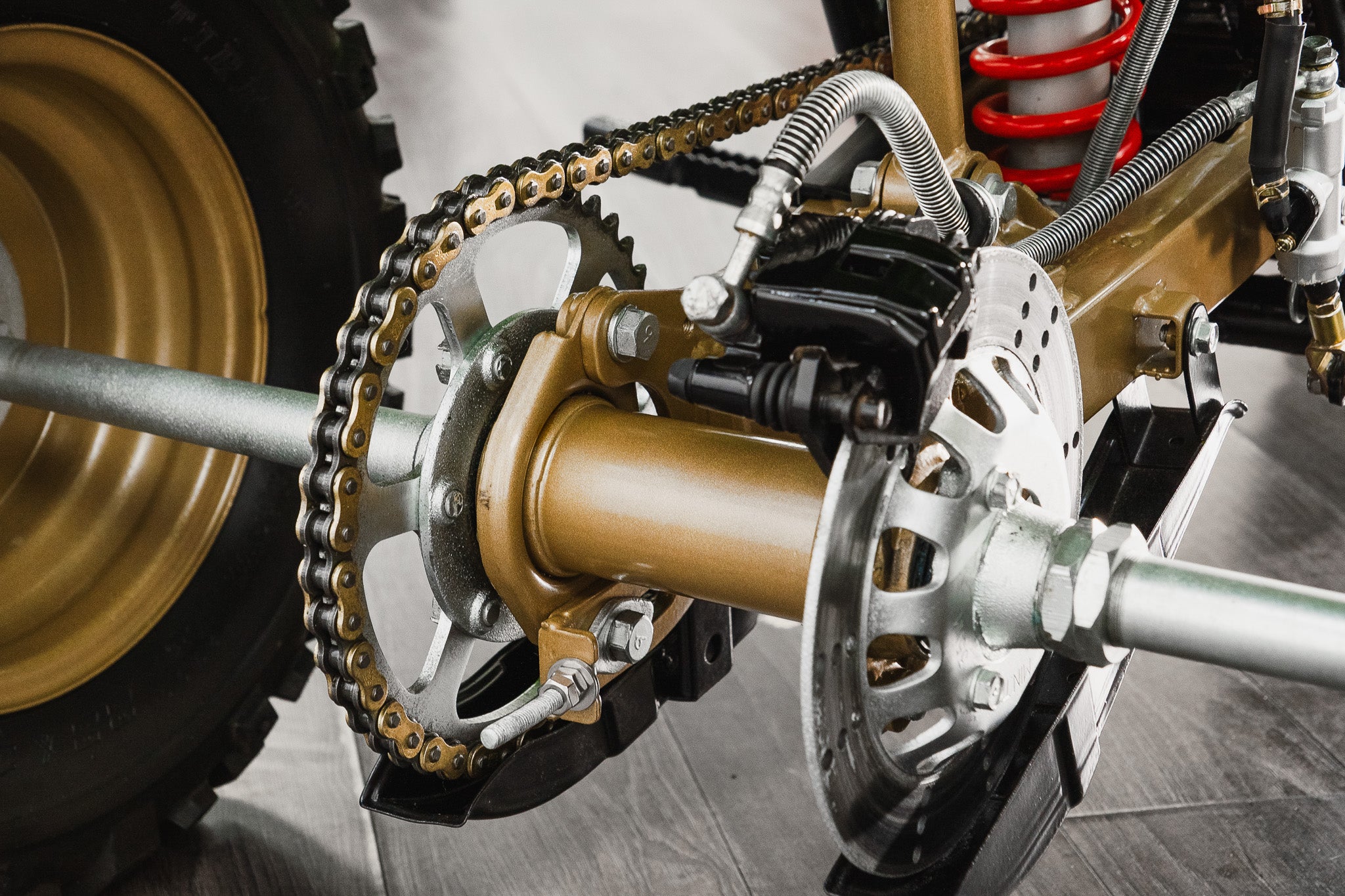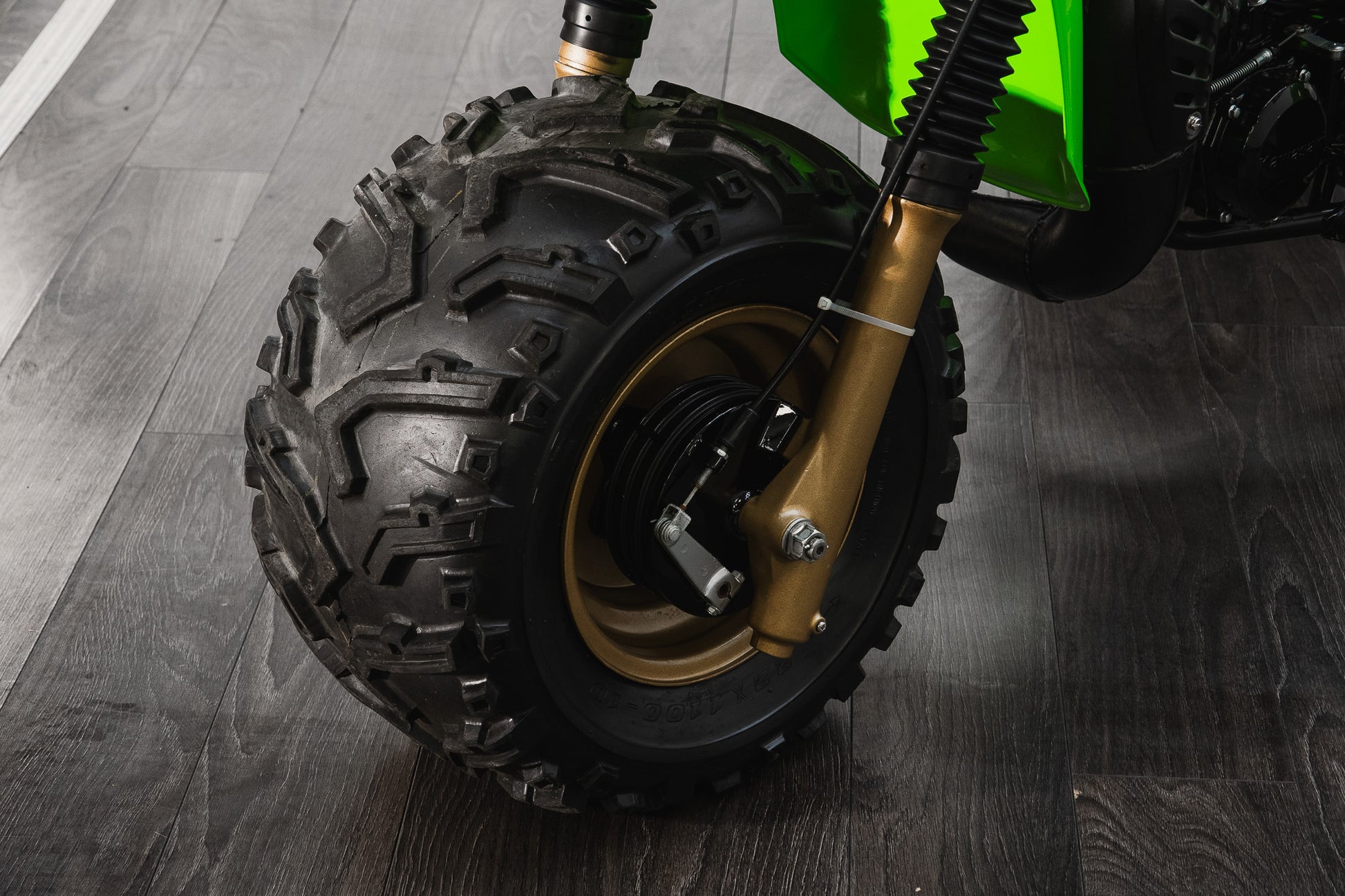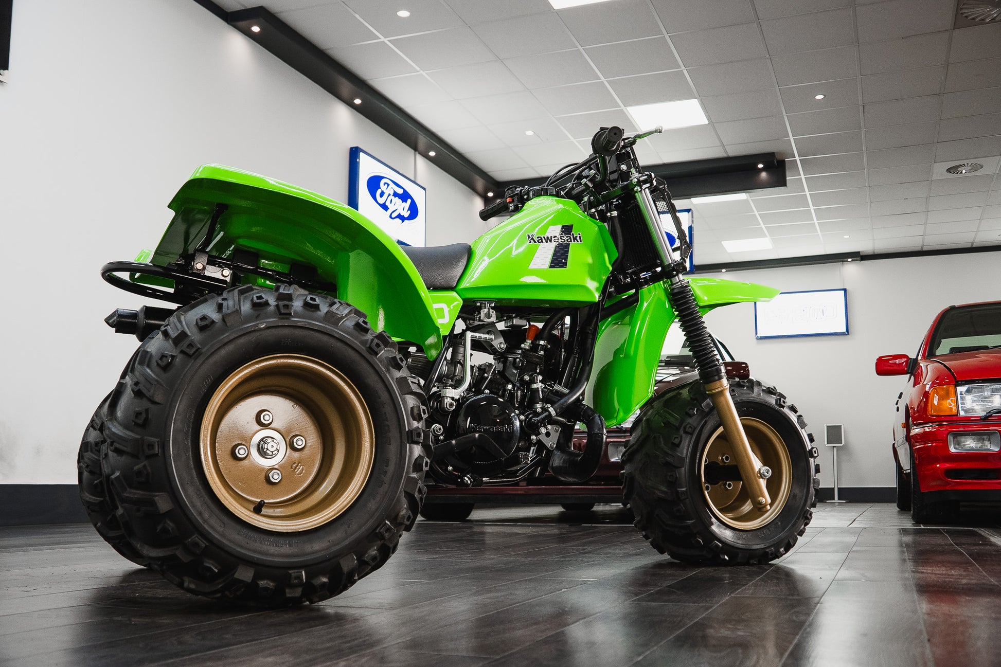 This example sits on correct 22 x 11.00-10 off-road tyres fitted to striking gold-coloured rims, all of which present in very good condition, complementing the overall aesthetic while remaining true to the machine’s purposeful stance.