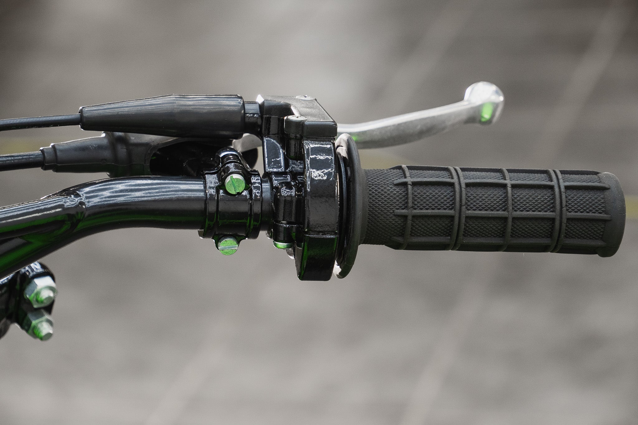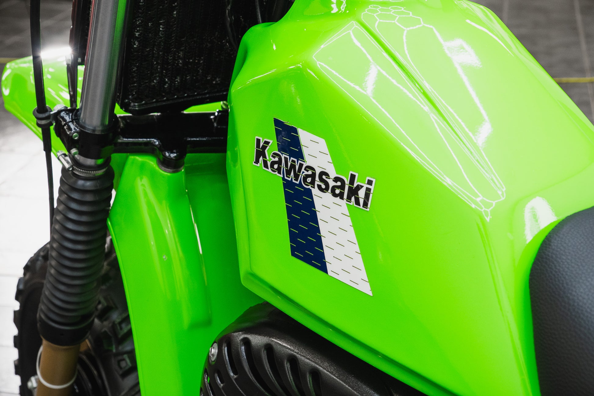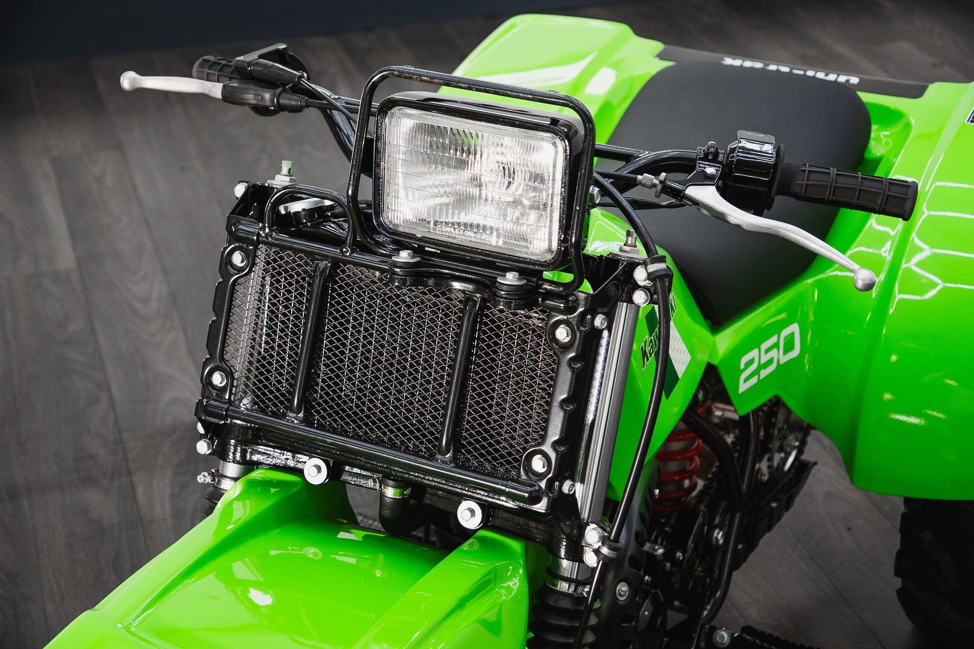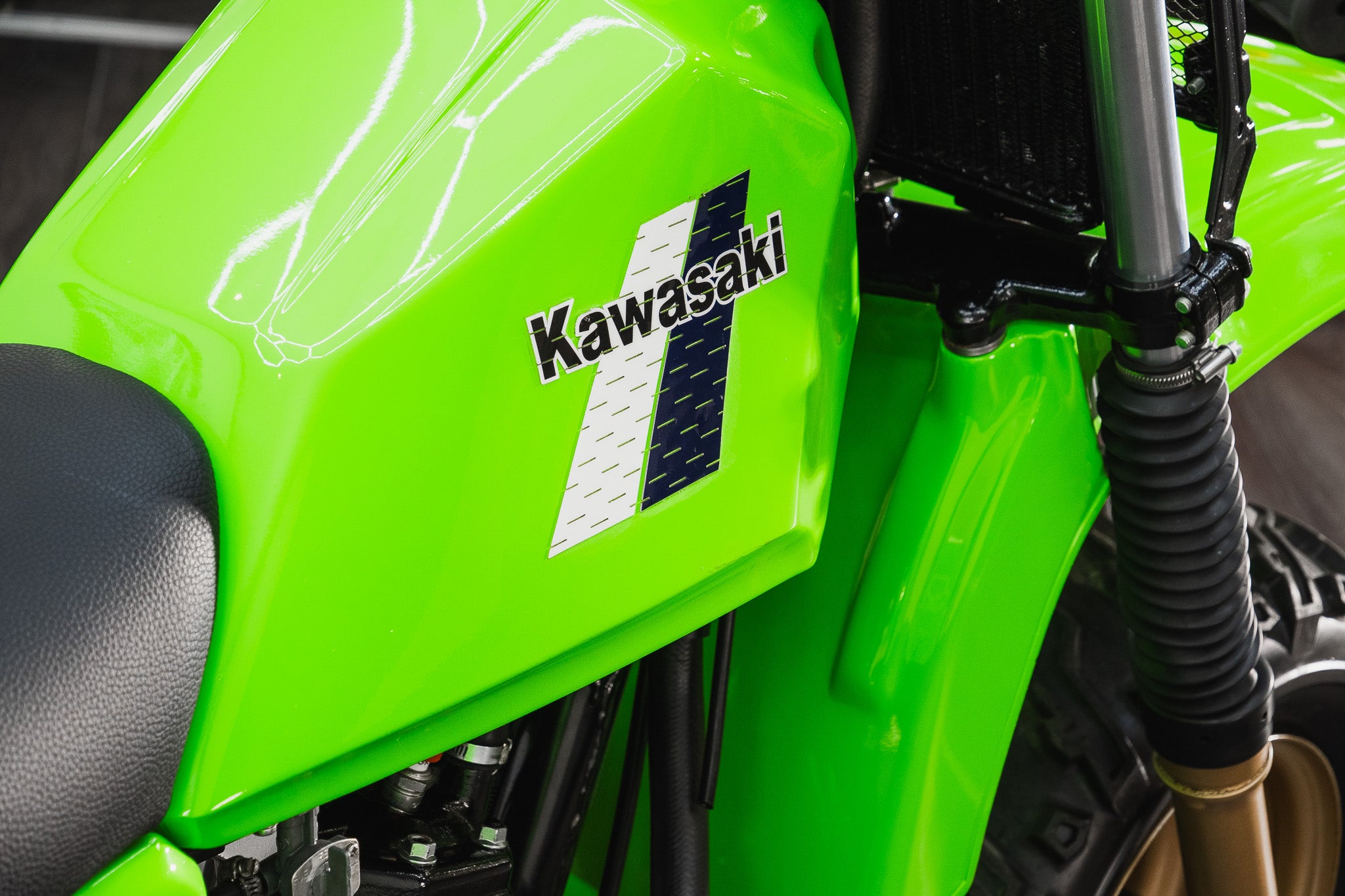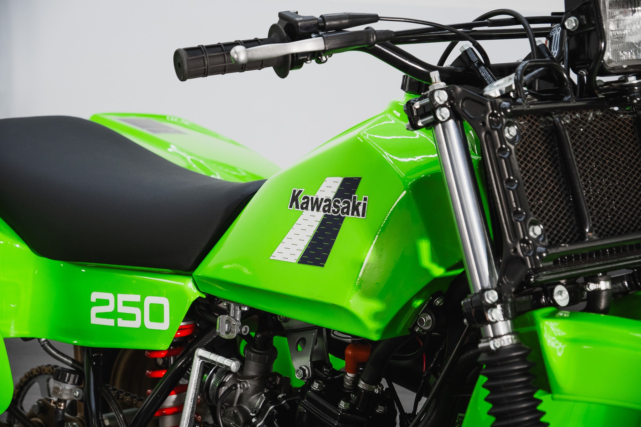 Finished in the unmistakable Kawasaki colouring 'Lime Green' the plastic mudguards and fairings present exceptionally well, retaining a deep even finish that immediately draws the eye. Period correct informational and factory decal stickers remain intact across the fuel tank, side panels, and rear fairings a detail often lost to time, but crucial in defining a genuine collector-grade machine.
