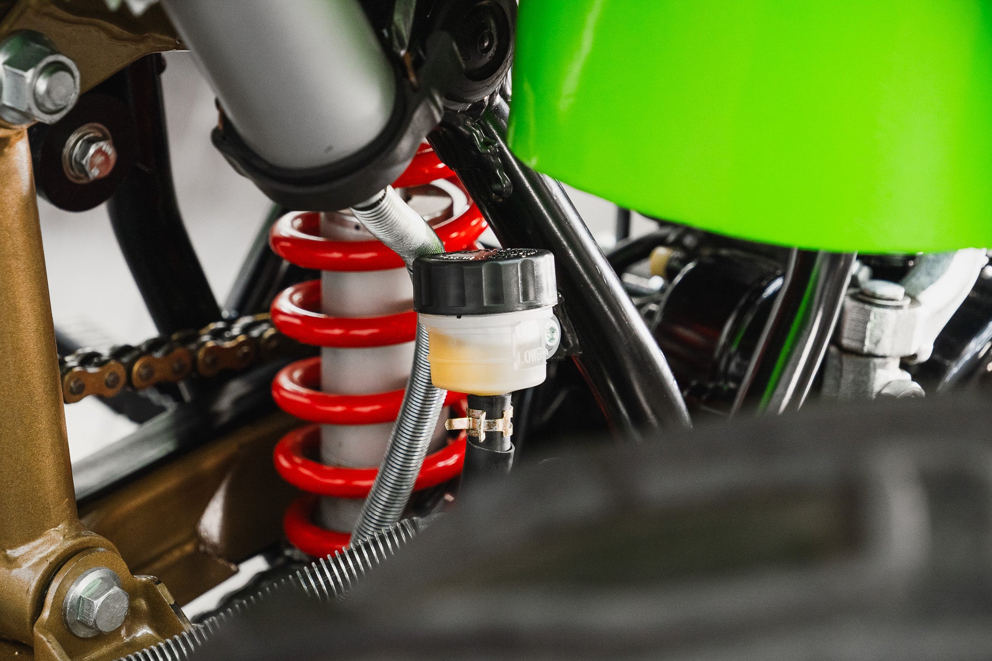 The chassis and framework finished in gloss black present in superb condition from front to rear along with the Gold colour rear arm The structure remains straight, clean, and well-preserved clearly reflecting a machine that has benefited from attentive care and a meticulous approach to maintenance throughout its life